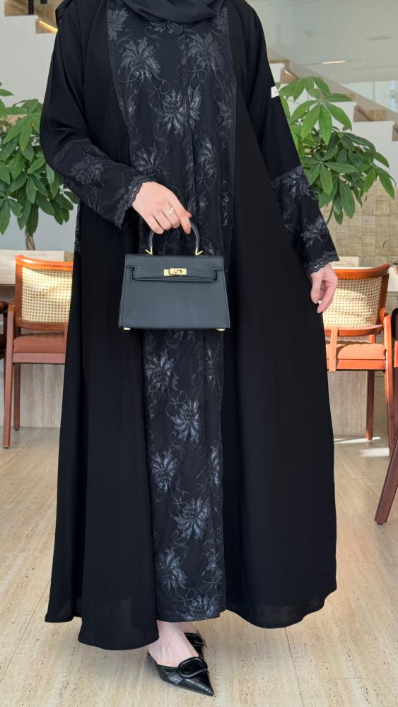 تمتاز هذه العباية بقماشها الفاخر من الكريب الملكي باللون الأسود الفاحم ، الذي يضفي لمسة فخامة وانسيابية في الحركة.. يزينها تداخل راقٍ من قماش الدانتيل الأسود في الجهة الأمامية والخلفية، ليمنحها طابعًا أنثويًا مميزًا ..