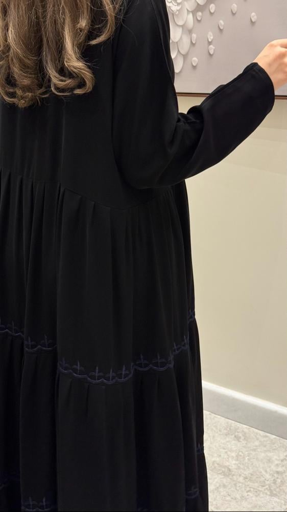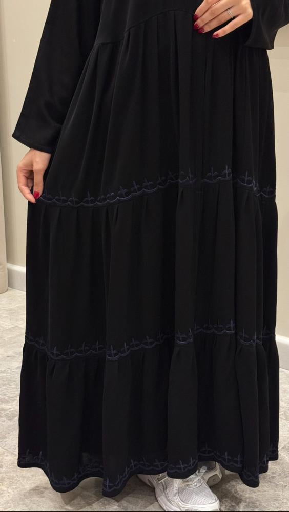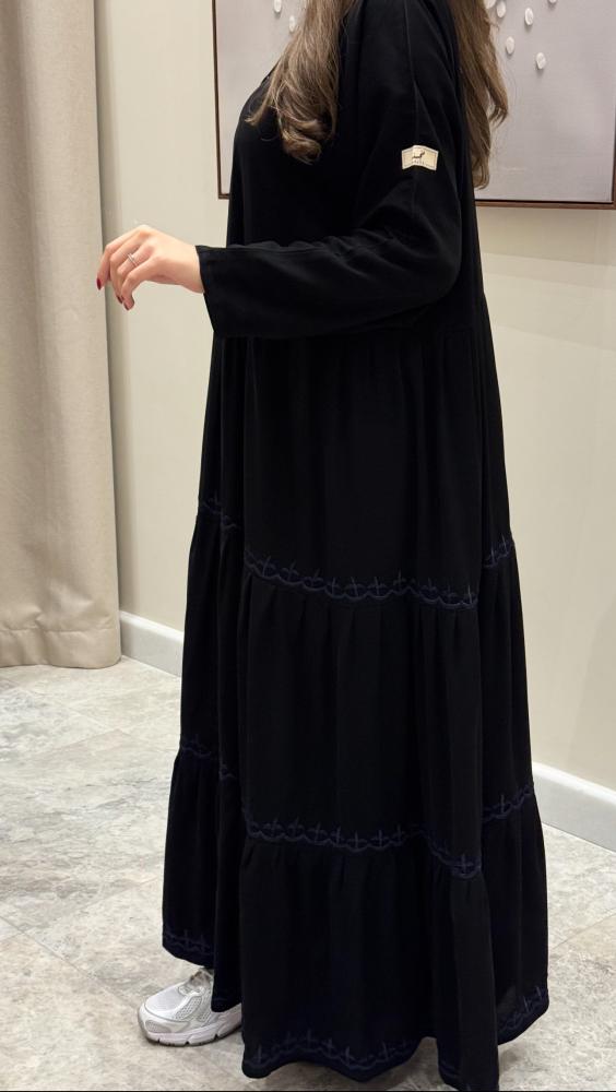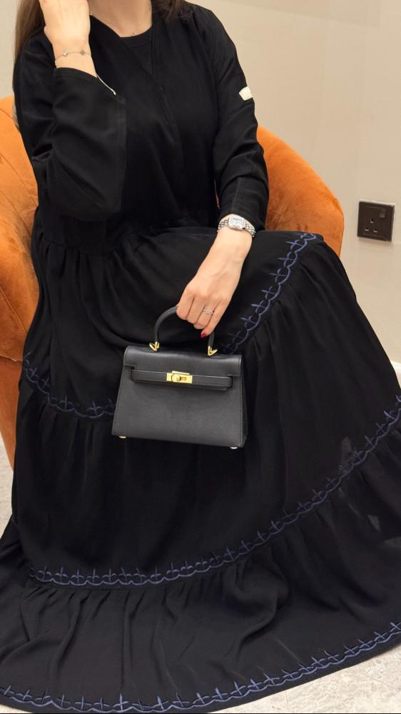 يزين العباية تطريز ناعم باللون الكحلي يضيف لمسة أنثوية فخمة ويبرز جمال الطبقات بشكل جذاب